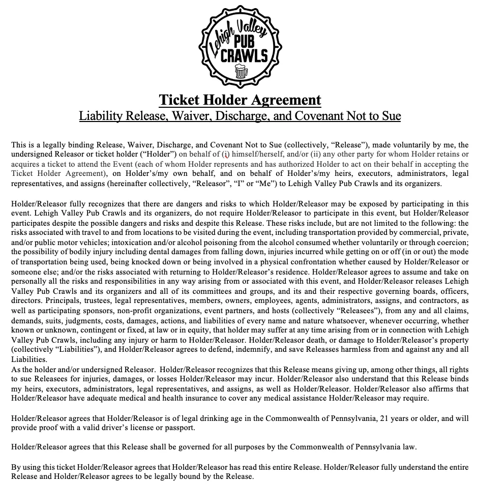 - Email us at info@LehighValleyPubCrawls.com